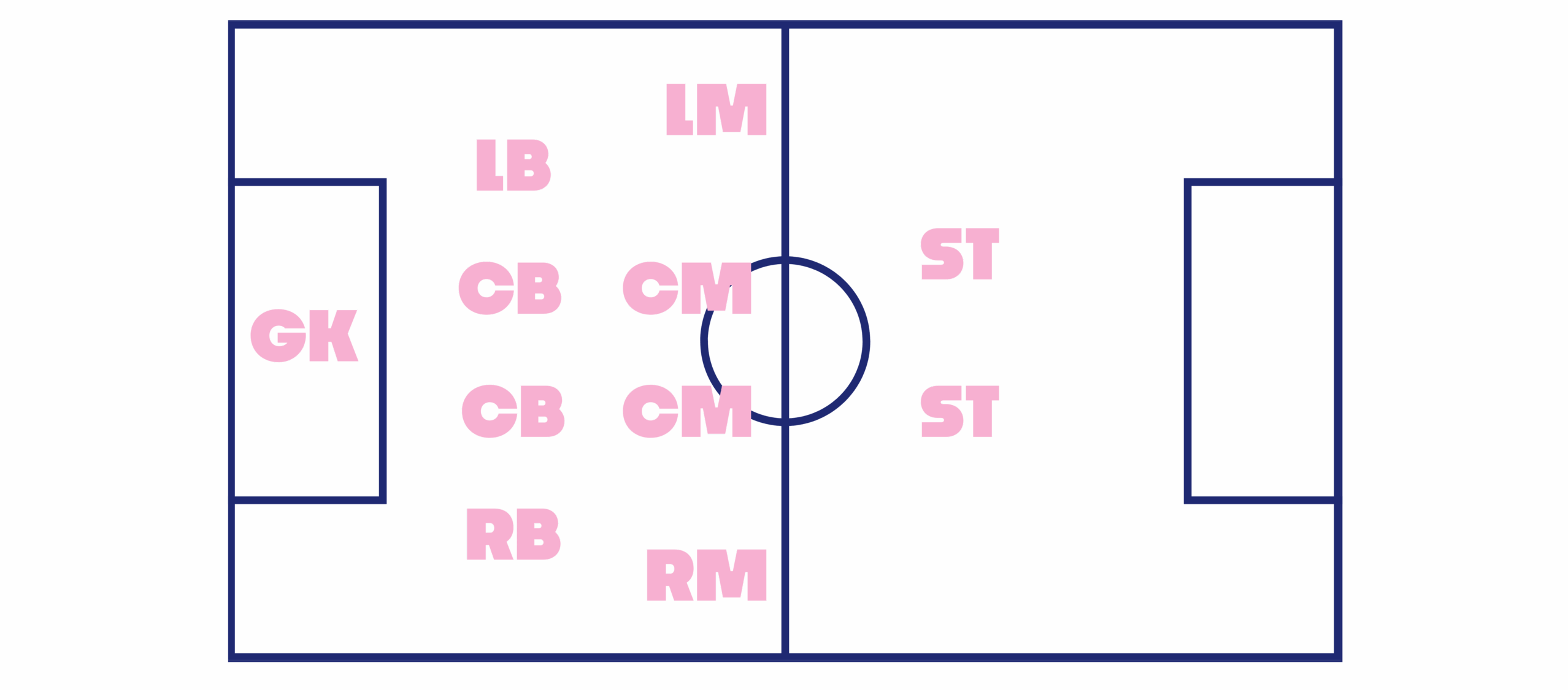 Role: They control possession, pass the ball, and create chances. Central Midfielders (CMs) link play and often dictate the game. Wide midfielders like Left Midfield (LM) and Right Midfield (RM) stay closer to the sidelines, providing crosses and supporting wingers/strikers. Midfielders may be defensive (breaking up attacks) or attacking (supporting strikers).