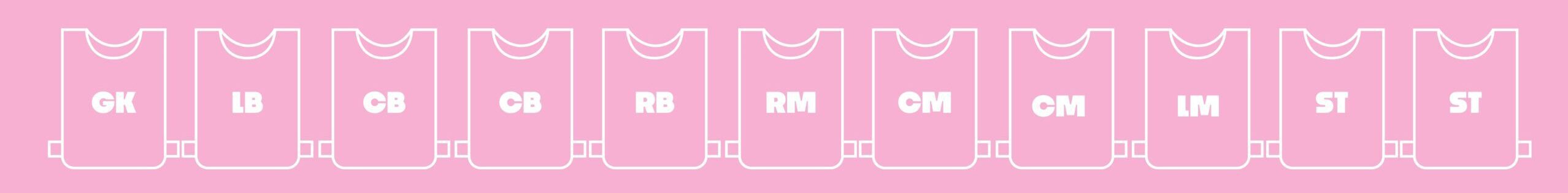 Positions: GK, defenders (CB + RB/LB), midfielders (CM/LM/RM), and striker(s).